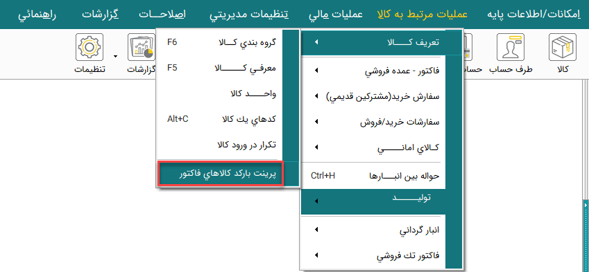مسیر دسترسی به پرینت بارکد کالاهای فاکتور