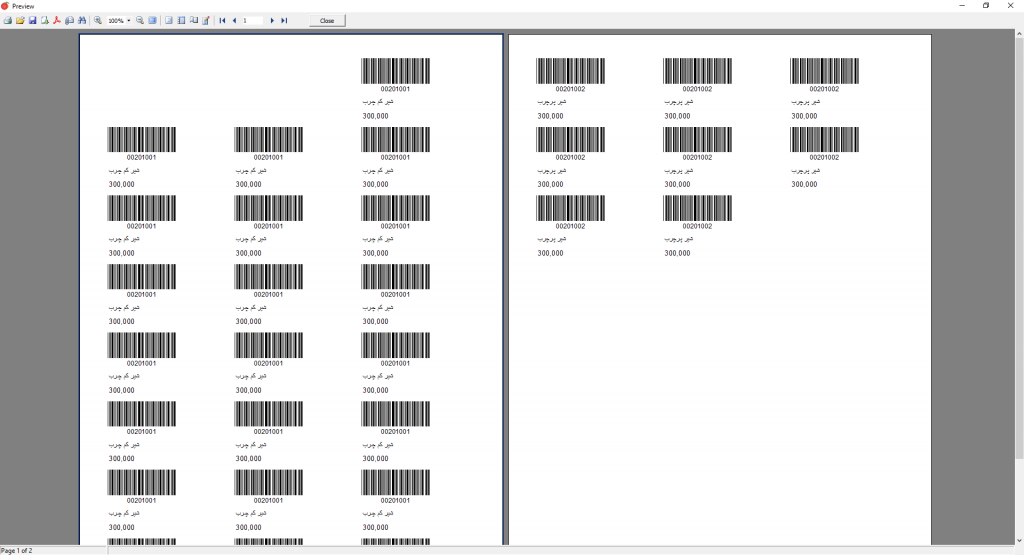 • بعد از زدن گزینه تایید صفحه بارکد‌ها را خواهید دید و با انجام تنظیمات بالای صفحه، می‌توانید برای چاپ اقدام کنید.