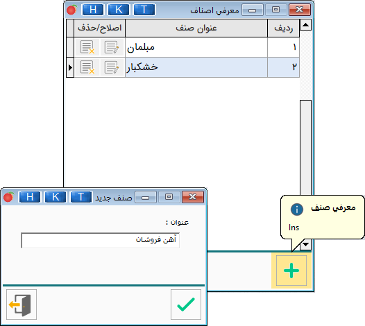• پس از کلیک فرم معرفی اصناف نمایش داده می‌شود. که می‌توانید هر یک از اصناف وارد شده را ویرایش یا حذف نمایید.