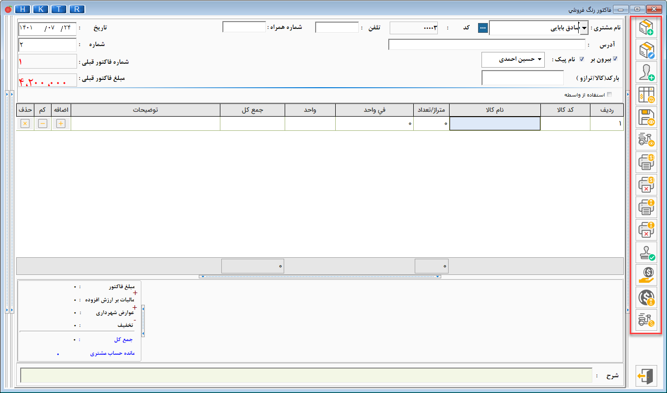 - در صفحه فاکتور رنگ فروشی بر اساس دسترسیهای کاربر، گزینههای مختلفی را در سمت راست منو مشاهده مینمایید.