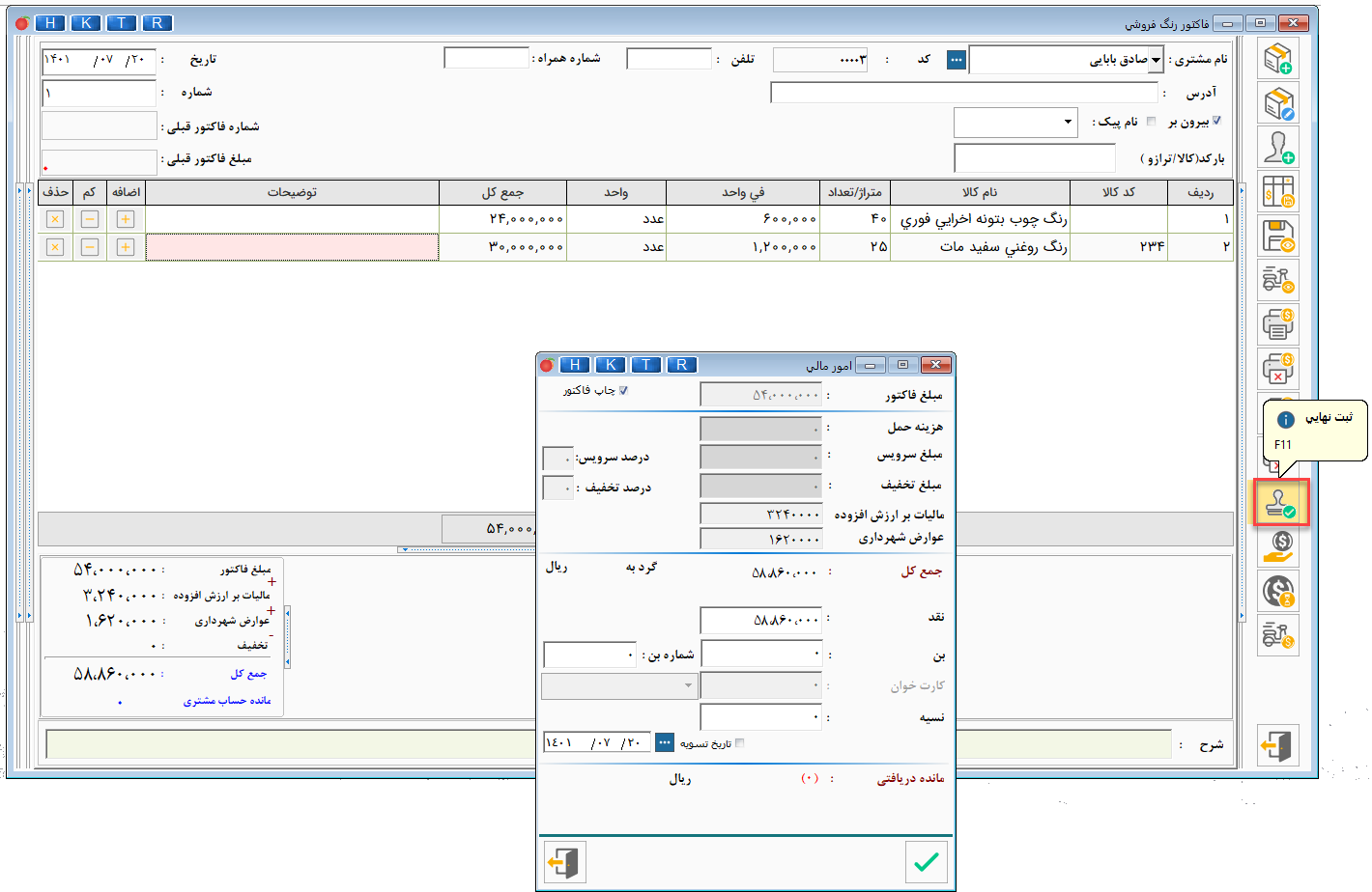- از منوی فاکتور رنگفروشی میتوانید پرداختها را نقدی یا نسیه انجام دهید.