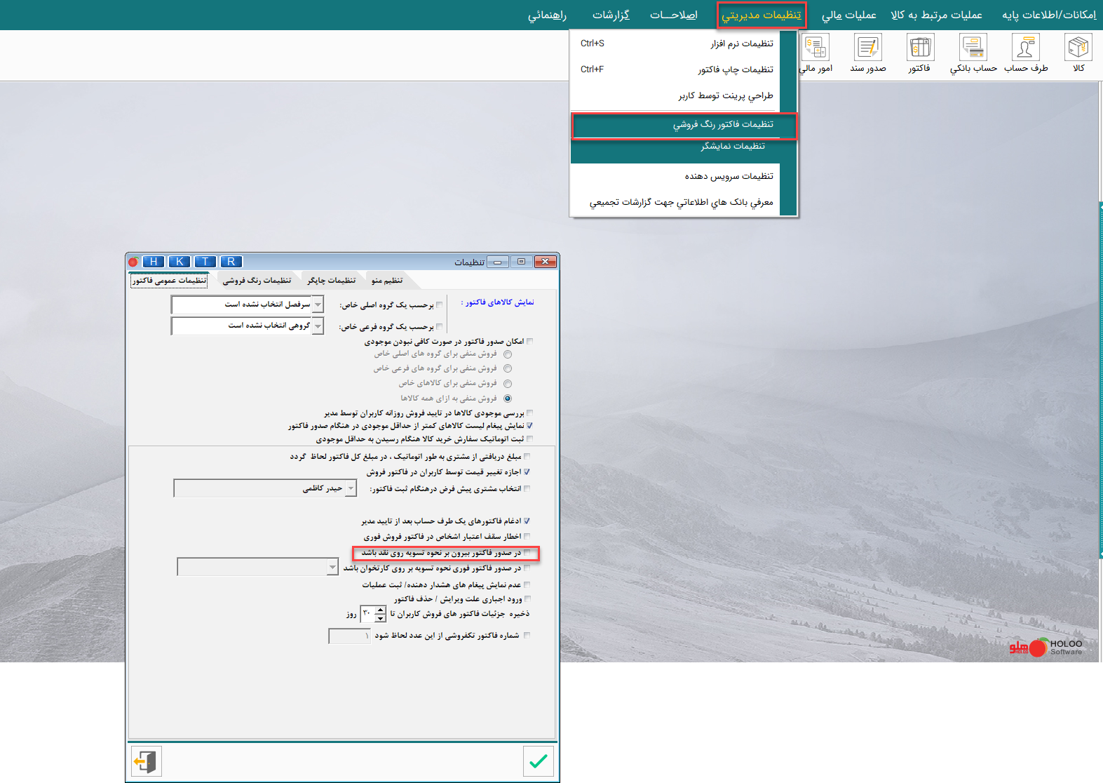 توجه: از مسیر تنظیمات مدیریتی / تنظیمات فاکتور رنگفروشی می توانید تنظیمات مربوط به این نوع صدور فاکتور را انجام دهید. به عنوان مثال تسویه صدور فاکتور بیرون بر را بر روی نقد تنظیم نمایید.