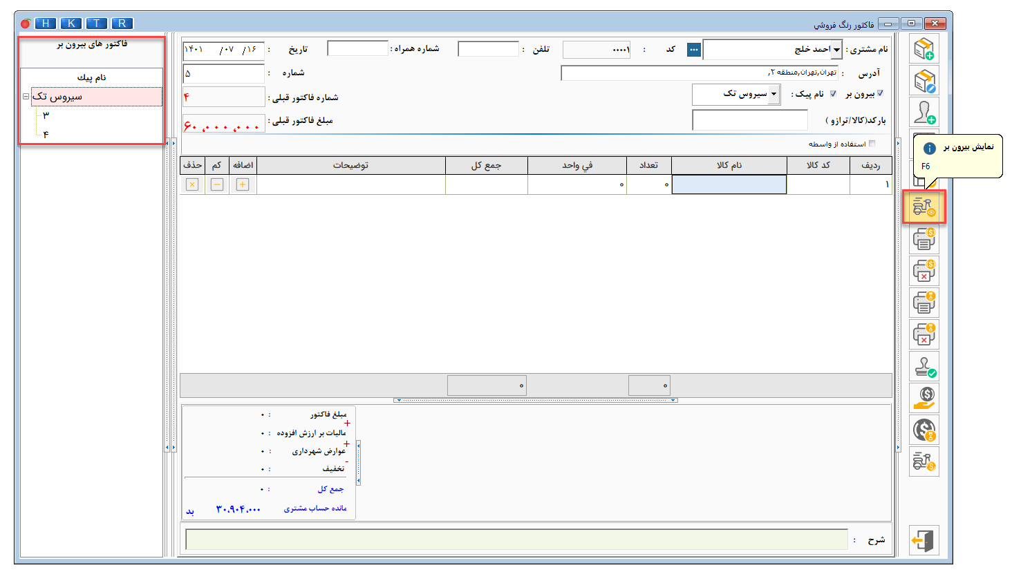 - با انتخاب دکمه نمایش بیرون بر فاکتورهای نسیه که با یک پیک بیرون بر صادر شده است را میتوانید مشاهده نمایید.
