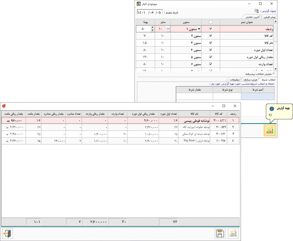 پس از معرفی گروهها و کالاها و صدور فاکتور، میتوانید بر اساس گروههای اصلی یا فرعی از تعداد و مقدار ریالی کالاها گزارش تهیه نمایید.