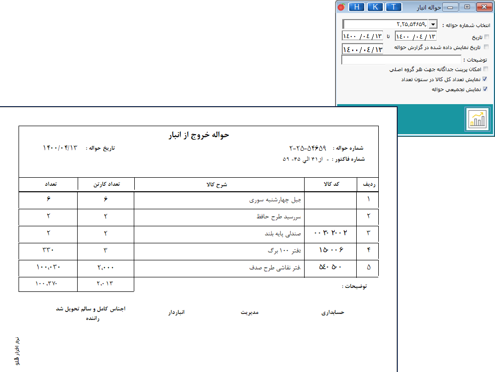 - در پنجره حواله انبار، ابتدا شمارههای حواله موردنظر را انتخاب کنید. پس از اعمال شروط، روی آیکون تهیه گزارش کلیک کنید. فرم حواله خروج را میتوانید چاپ و یا ذخیره کنید.
