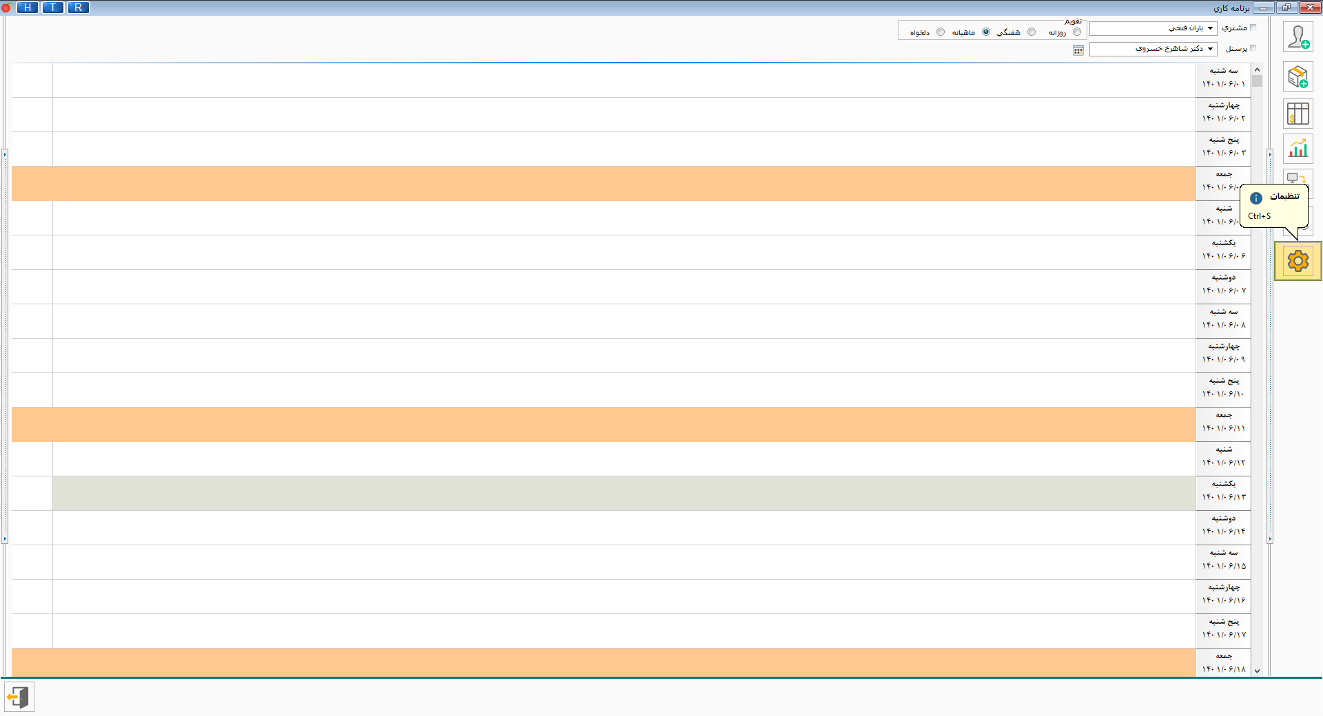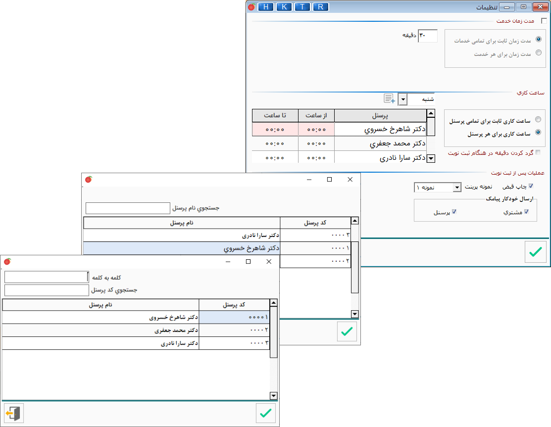 • در پنجره تنظیمات، ابتدا با انتخاب گزینه مدت زمان خدمت، در کادر، زمان را وارد کنید. اگر زمان خدمات با یکدیگر تفاوت داشته باشند، گزینه مدت زمان برای هر خدمت را انتخاب کرده و برای جستجوی نام خدمت از کلید space کیبورد استفاده کنید تا پنجره جستجو باز شود. با زدن دکمه F5 جستجو بر اساس نام و کد کالا  تغییر می‌کند و با زدن دکمه F6 کادر جستجو بر اساس کلمه مورد نظر اضافه و با زدن دکمه F7 این کادر بسته می‌شود. برای تعیین ساعت کاری، می‌توانید بازه زمانی کلی تعریف کنید و یا برای هر پرسنل بازه زمانی مخصوص به خود را مشخص نمایید. با انتخاب ساعت کاری برای هر پرسنل، روبروی نام وی، زمان کاری را مشخص کنید. برای جستجوی نام پرسنل از کلید space کیبورد استفاده کنید تا پنجره جستجو باز شود. با زدن دکمه  F5 جستجو بر اساس نام و کد پرسنل  تغییر می‌کند و با زدن دکمه F6 کادر جستجو بر اساس کلمه مورد نظر اضافه و با زدن دکمه F7 این کادر بسته می‌شود. سپس تعداد چاپ قبض را مشخص کنید و ارسال پیامک برای پرسنل و مشتری را تعیین نمایید.